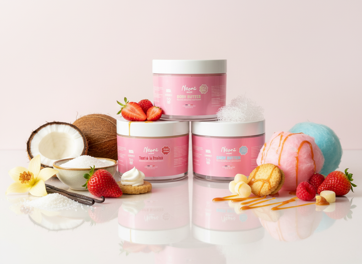 Des beurres corporels chantilly, des huiles parfumées faits main, aux couleurs pastel et aux senteurs sucrées comme un dessert.